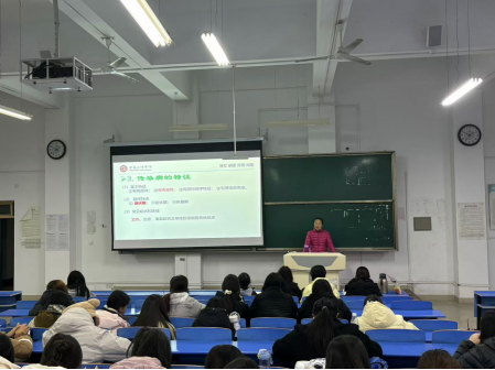 赵菊英从传染病概念、流行的基本环节、基本预防措施入手,向师生介绍了传染病基本认识,重点讲解了校园常见传染病如诺如病毒、结核病、流行性出血热、艾滋病的发病机制、临床表现、治疗方法及预防措施,特别强调个人卫生习惯、密集区域消毒通风、接种疫苗等具体保护措施的重要性。