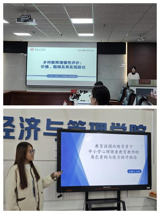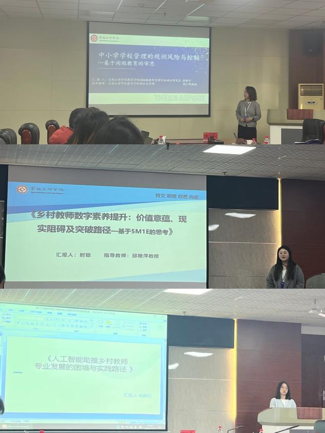 此外,我院5位研究生也在各平行论坛积极发言,张昕宇、时聪、李钰萱、吴燕子和王欣分别作了题为《中小学学校管理的规训风险与控制——基于闲暇教育的审思》、《乡村教师数字素养提升:价值意蕴、现实阻碍及突破路径——基于5M1E的思考》、《人工智能助推乡村教师专业发展的困境与实践路径》、《乡村教师增值性评价:价值、阻碍及其实现路径》和《教育强国战略背景下中小学心理健康教育教师的角色重构与能力提升路径》的报告。
