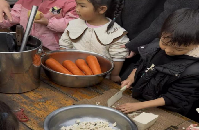 幼儿园深度践行 “一日生活皆课程” 理念,将午餐环节化为生动的课堂。孩子们与老师分工协作,和面、搓条、揪剂、揉麻食,一步步亲手打造传统美食--麻食。