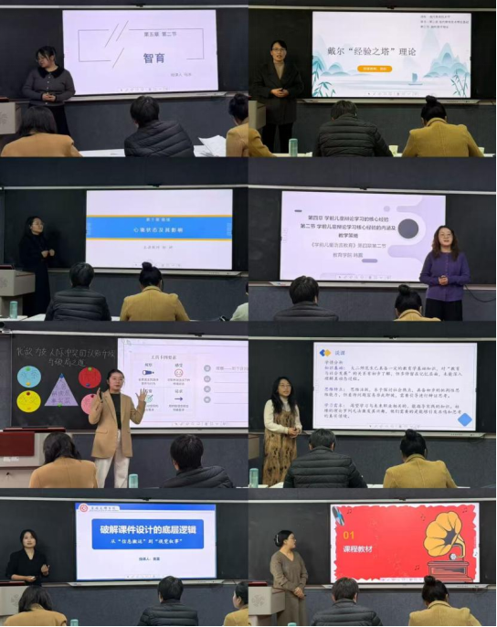 大赛上半场,韩露、韩怡、吴秋含、王颖四位老师依次上台做教学展示,他们分别带来了《学前儿童游戏化学习核心技能内容及教学策略》《戴尔“经验之塔”理论》《基本乐理》以及《化敌为友:人际冲突的认知升级与破局之道》四堂课的教学展示;大赛下半场,王杰敏、黄萱、邹妍、马沛四位老师分别以《教育的文化功能—文化选择》《破解课件设计的底层逻辑—从“信息搬运”到“视觉叙事”》《心境状态及其影响》《智育》为题做教学展示。