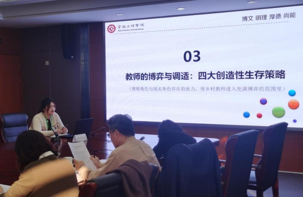 2024级教育学原理研究生周佳欣在第四分论坛以《国家话语与地方实践:乡村教师角色期待的博弈与调适》为题作了汇报。报告中分析指出,当前乡村教师在国家话语下引发了角色超载与认同危机。基于此,她探索乡村教师发展路径,为理解乡村教师生存逻辑提供了全新解释框架。